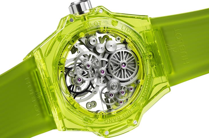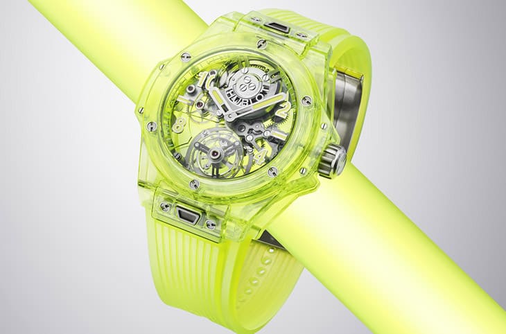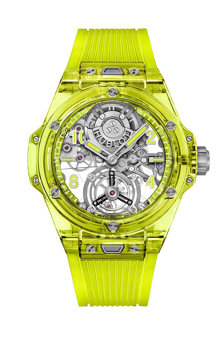 ▲Big Bang陀飞轮萤光黄SAXEM手表採用宇舶独家研发的材质,外观呈现特殊的透明色调。