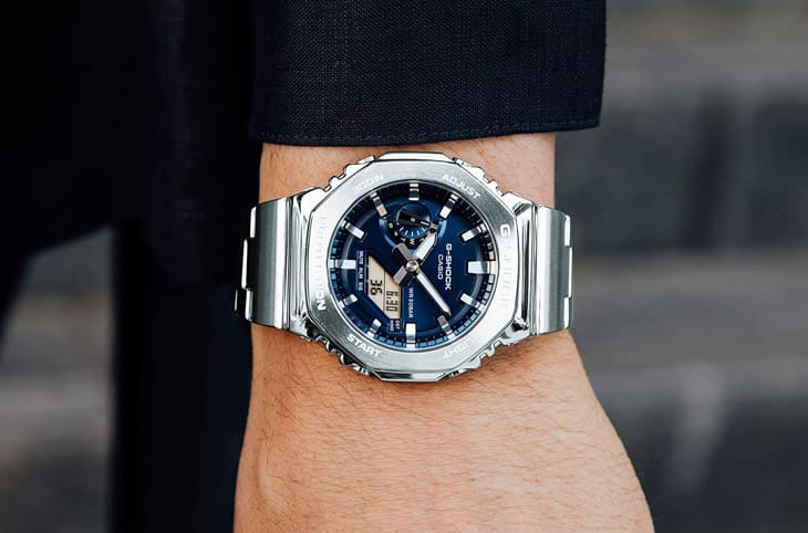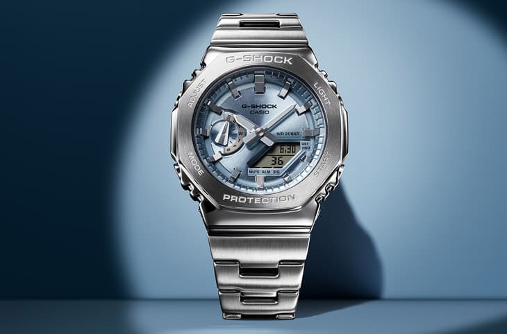 CASIO卡西欧G-SHOCK在中价位入门款的G-Steel系列商品线加入2100系列的八角表壳设计,其特色为金属外壳搭配玻璃纤维强化树脂内壳,透过内外异材质打造分层防护构造,GM-2110D共推出天空蓝、海军蓝、活力橘、经典银与莱姆绿5种配色。