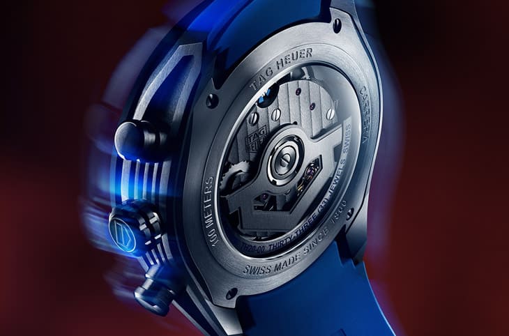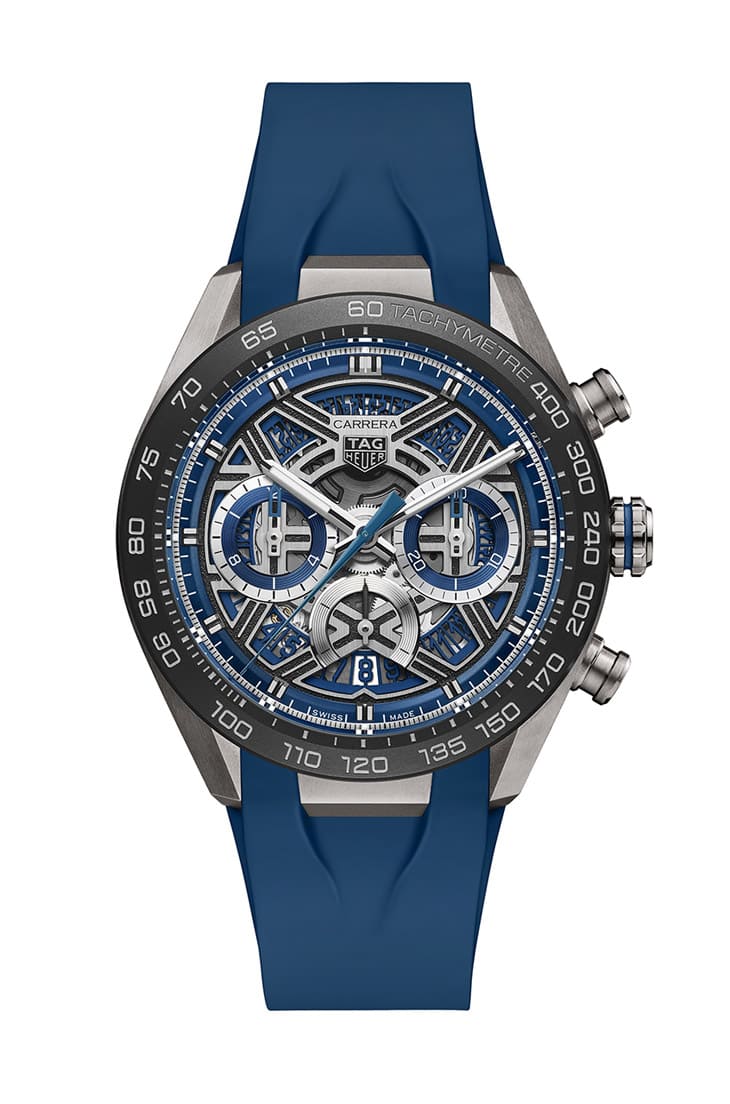 以上这六款Carrera Extreme Sport系列表背都是透明底盖,其中计时款可见内部的TH20-00自动机芯,其动力储存达80小时之多,而陀飞轮计时码表则是搭载Heuer 02的高配进化版——TH20-09自动机芯,机芯内部蕴含导柱轮、垂直离合机制,还有融入品牌标志的盾形镂空自动盘,由于机芯功能较复杂,因此其耗能也会更兇,不过品牌仍坚持发挥手表的实用性,因此其动力储存得以维持在65小时水准,对照同功能组合的手表而言极具竞争力。