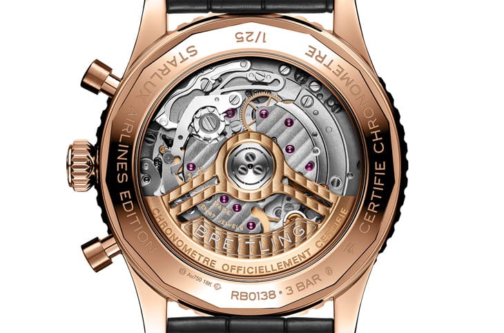 ▲透明底盖露出百年灵着名的B01机芯,同时底盖周围还刻有星宇航空联名字样以及手表的限量编号。