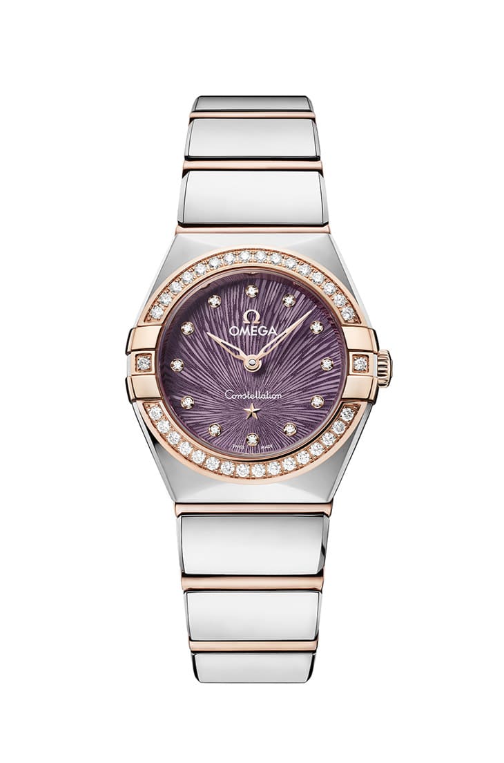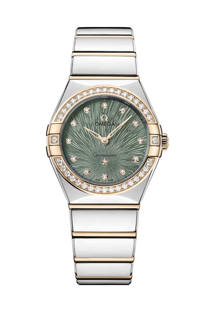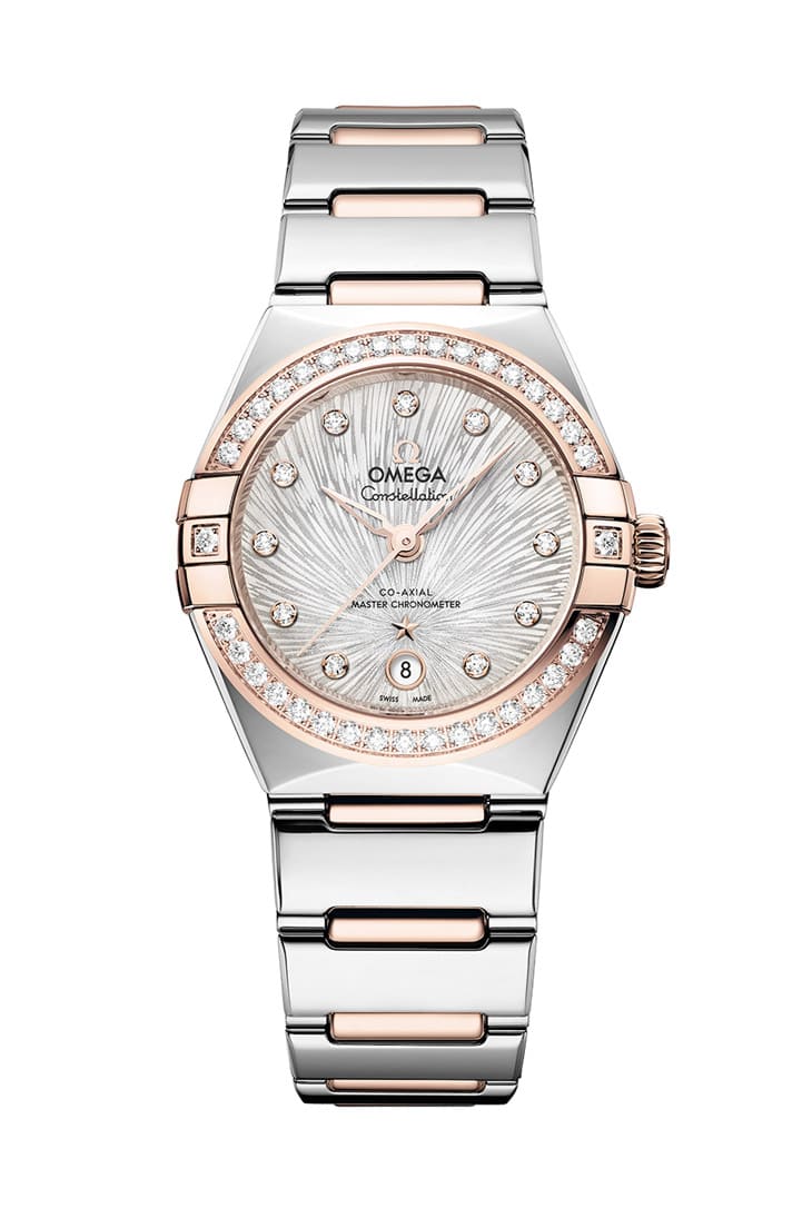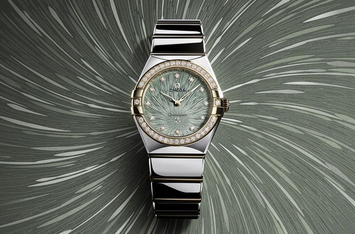 面盘上镶嵌12颗钻石作为时标,6点方向镶有象徵星座系列的立体星星图案——前述面盘的放射纹就是从星星图案往四面八方蔓延,而其实欧米茄已经不是第一次使用这种面盘装饰,早在2008年时品牌就已经推出过带有这种设计的星座女表;相隔16年后,欧米茄又再度把这种让人看得心情愉悦的图案带回星座系列中,包括珍珠母贝面盘在内,据说这次三种尺寸的星座系列女表将会有多达20种顏色诠释同样的纹路。