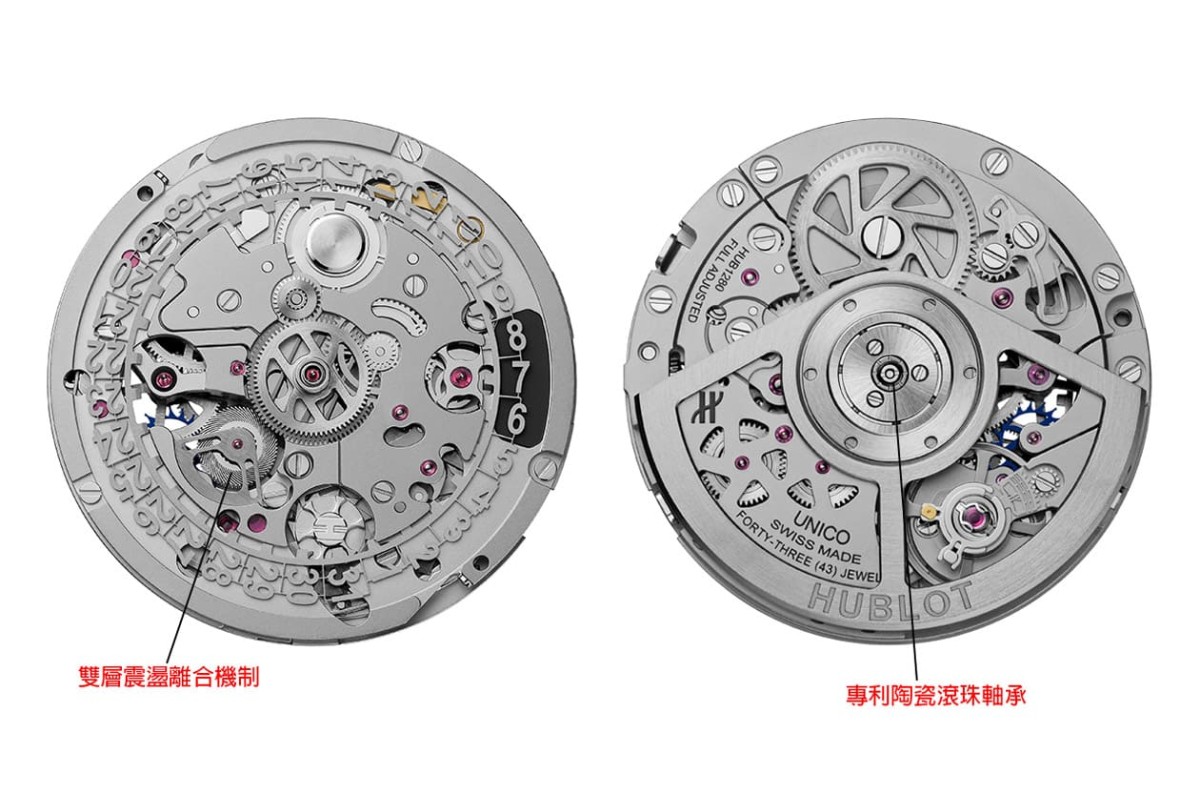 Big Bang Unico左冠陶瓷计时码表搭载的HUB1280机芯有许多提升腕表避震性能的设计,包括机芯中央轴心的H形避震系统,虽然平时叠在指针下不容易发现,但正是多了这套避震系统的缓冲效果,得以降低腕表受到撞击时对于机芯结构的影响。