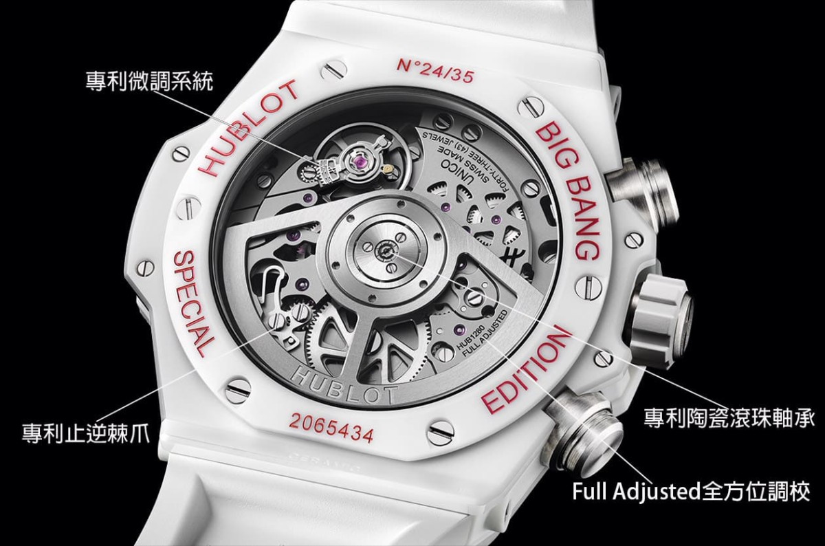 陶瓷材质/HUB1280自动上链机芯/时、分、小秒、日期显示/计时码表功能/蓝宝石水晶镜面、透明底盖/防水100米/表径42mm/限量35只/参考价:NT$ 812,000