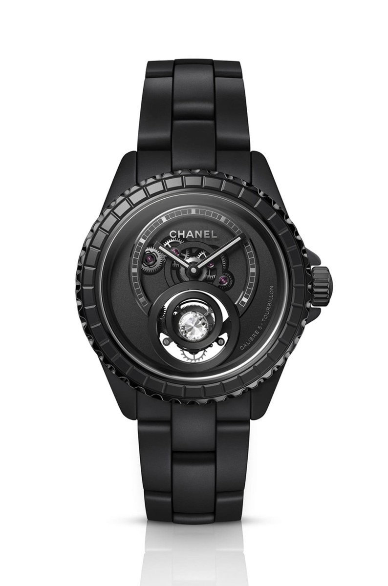 ▲身为香奈儿首枚自制陀飞轮机芯,Caliber 5在陀飞轮轴心镶上大型钻石,于J12陶瓷腕表上绽放迷人光彩。