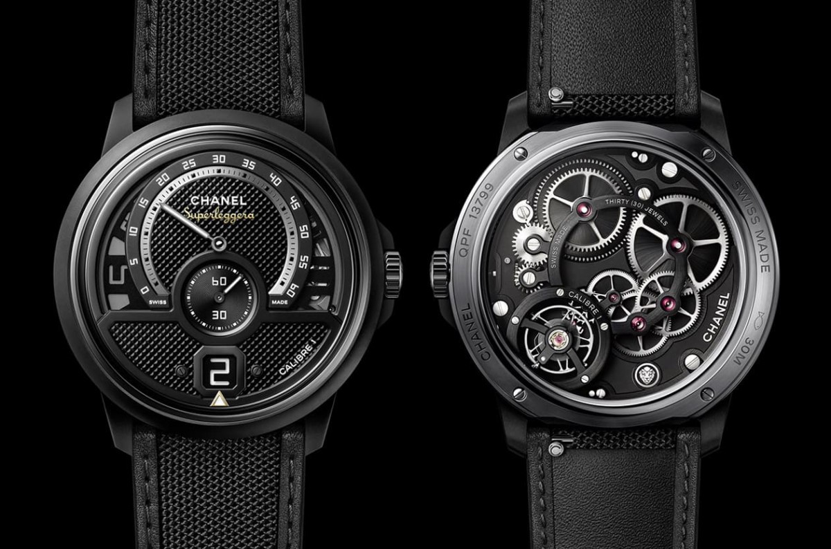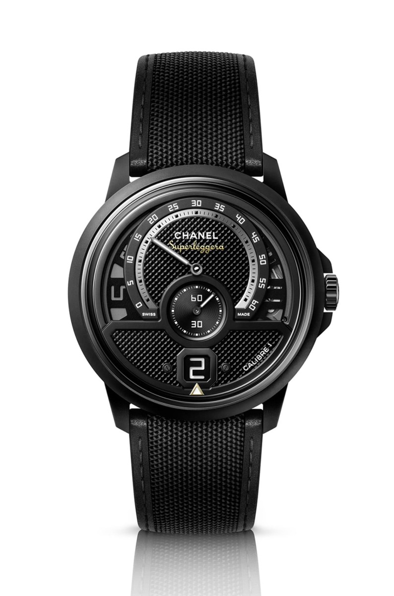 2024年香奈儿也持续奠基于这两款里程碑式机芯创作新品,其中搭载Caliber 1的是Monsieur Superleggera深邃黑腕表。品牌继2021年后再度由赛车世界擷取灵感,新款作品採用黑色雾面高抗磨陶瓷制作,搭配黑色尼龙表带,由此展现出与Monsieur系列刚出道时优雅绅士路线同中求异的热血动感。Caliber 1发展至2024年已经趋于成熟,也因此香奈儿的设计更见大胆奔放,腕表面盘饰有黑色扭索纹,同时香奈儿还以黑色桥板或框架区隔出逆跳分钟、小秒盘以及日期视窗等区域,其中逆跳分钟刻度环两侧都稍加镂空,露出部分机芯零件以及小时转盘,而包括12点方向的"Superleggera"字样以及跳时视窗下方的三角形标记都改为抢眼的金色,在腕表的全黑造型中格外抢眼,亦增添了一股香奈儿作品独有的高贵奢华风格。