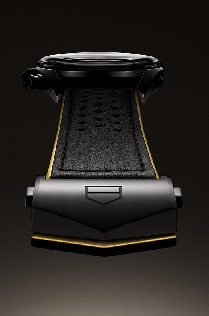 ▲手表的黑色穿孔小牛皮表带特别将黄色衬裡延伸至表带边缘,双色设计让手表的视觉层次更丰富。