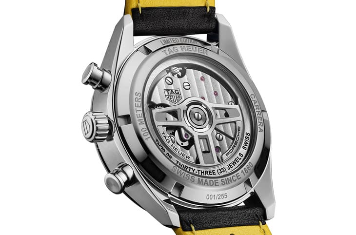 表款背面可见TH20-09自动机芯,它的镂空自动盘就和其他TAG HEUER x PORSCHE联名表一样设计成保时捷赛车方向盘造型,同时在自动盘两侧也分别刻上双品牌标志,散发出与众不同的联名意义。这枚机芯除了身负两大复杂功能,它的动力储存还有65小时颇令人惊艳。表主不仅可以好好欣赏机芯的精密结构,也绝对会注意到在透明底盖边缘下方的限量编号,TAG HEUER Carrera x PORSCHE陀飞轮计时码表泛美公路赛限量版全球限量发行255只,其中数字后两码代表着1954年参加卡莱拉泛美公路赛夺冠的保时捷550 Spyder赛车编号"55",藉此向这段保时捷的历史荣光,以及后来启发泰格豪雅创作出Carrera系列的深刻意义表达高度敬意。