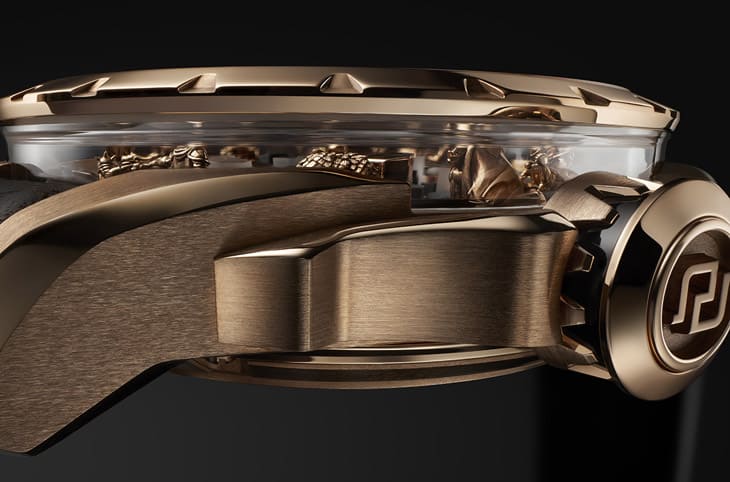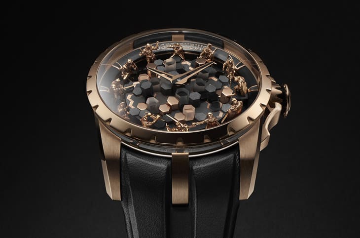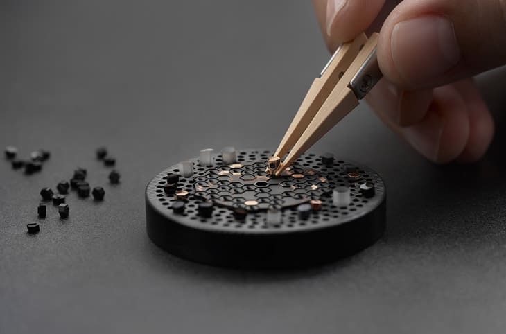 品牌工艺师后续会将56块金属六角形方块一一填入基座,每颗方块的高度从0.2mm~3.7mm不一而足,如此面盘并能呈现出凹凸有致的效果;不止如此,罗杰杜彼还加码增添28块玄武岩、9块玫瑰金、10块黑玻璃以及9块透明玻璃,这让面盘的立体感和视觉感受都富有层次,甚至细看这些六角形方块会发现它们顶层并非全平面,而会呈现略为倾斜的角度,据知这种幻象设计有助于突显基座的体积与深度,使得面盘充满引人入胜的吸引力。
