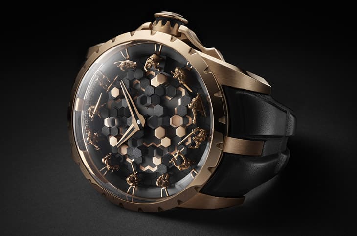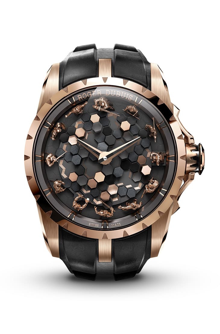 罗杰杜彼以玫瑰金材质制作手表表壳,搭配具有表带快拆系统的黑色牛皮表带,尽显王者般的雍容气势。这系列手表奠基于Excalibur系列的外型,不过面般完全自成一格,而且从首款圆桌骑士手表登场以来,品牌也不断变化面盘上的设计,令面盘核心的圆桌骑士金雕总是能在各种创意表现下诠释出彼此的独特个性。