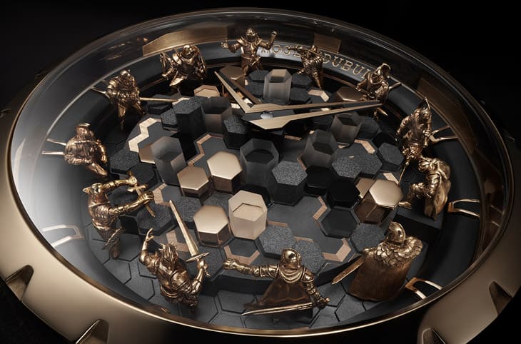 ▲罗杰杜彼制作出12尊神态各异、细节入微的圆桌骑士金雕,在面盘上兼作时标的作用。
