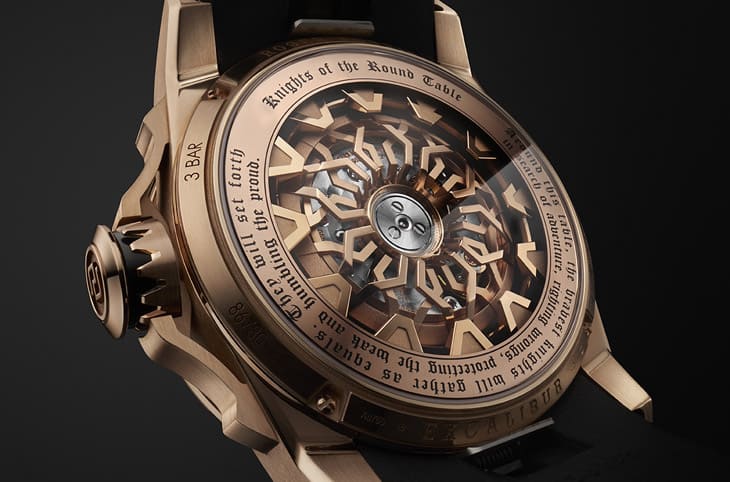 18K玫瑰金材质/RD821自动上链机芯/时、分显示/玫瑰金、玄武岩、穆拉诺玻璃面盘,面盘设有12尊金雕骑士/日内瓦印记/蓝宝石水晶镜面、透明底盖/防水30米/表径45mm/限量28只/参考价:NT$ 11,215,000