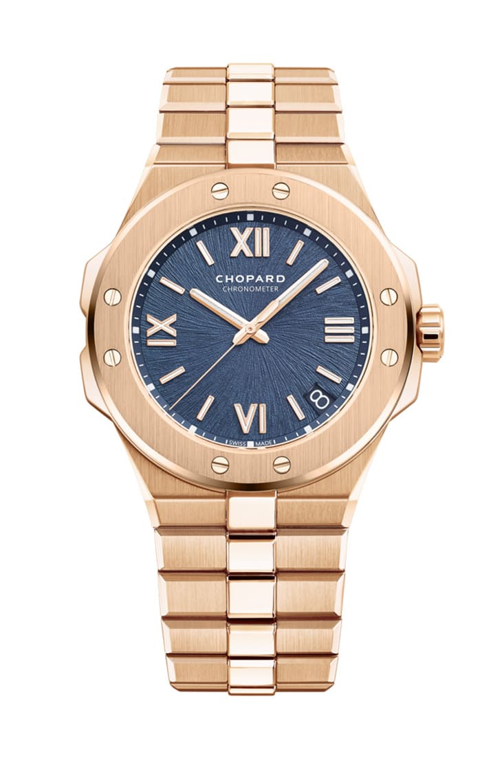 Alpine Eagle初次登场时就已经有41mm和36mm等两种三针腕表尺寸,前者男表导向较强烈,后者则是男、女皆宜。萧邦在系列问世后不久持续延伸出更多款式,例如以符合伦理道德标准的玫瑰金制作表壳、链带,搭配系列经典的阿莱奇蓝色面盘(灵感源自瑞士阿莱奇冰川的顏色)的款式,呈现出与精钢款式同工异曲的高雅个性。Alpine Eagle系列一大特徵在于面盘饰有放射状纹理,萧邦是从老鹰眼睛的虹膜或得启发,再者秒针造型也是仿效自雄鹰的羽毛而生,因此腕表整体予人一股轻盈、飞翔的视觉美感,在贵金属表壳的烘托下,佩戴者更能深刻感受外部零件经过拉丝、拋光以及倒角等多重工艺成就的细腻层次,例如经过拋光晶亮闪耀的中央链节,与两侧链节低调的打磨便形成鲜明对比,更易引人注意Alpine Eagle腕表富有切面的外型。