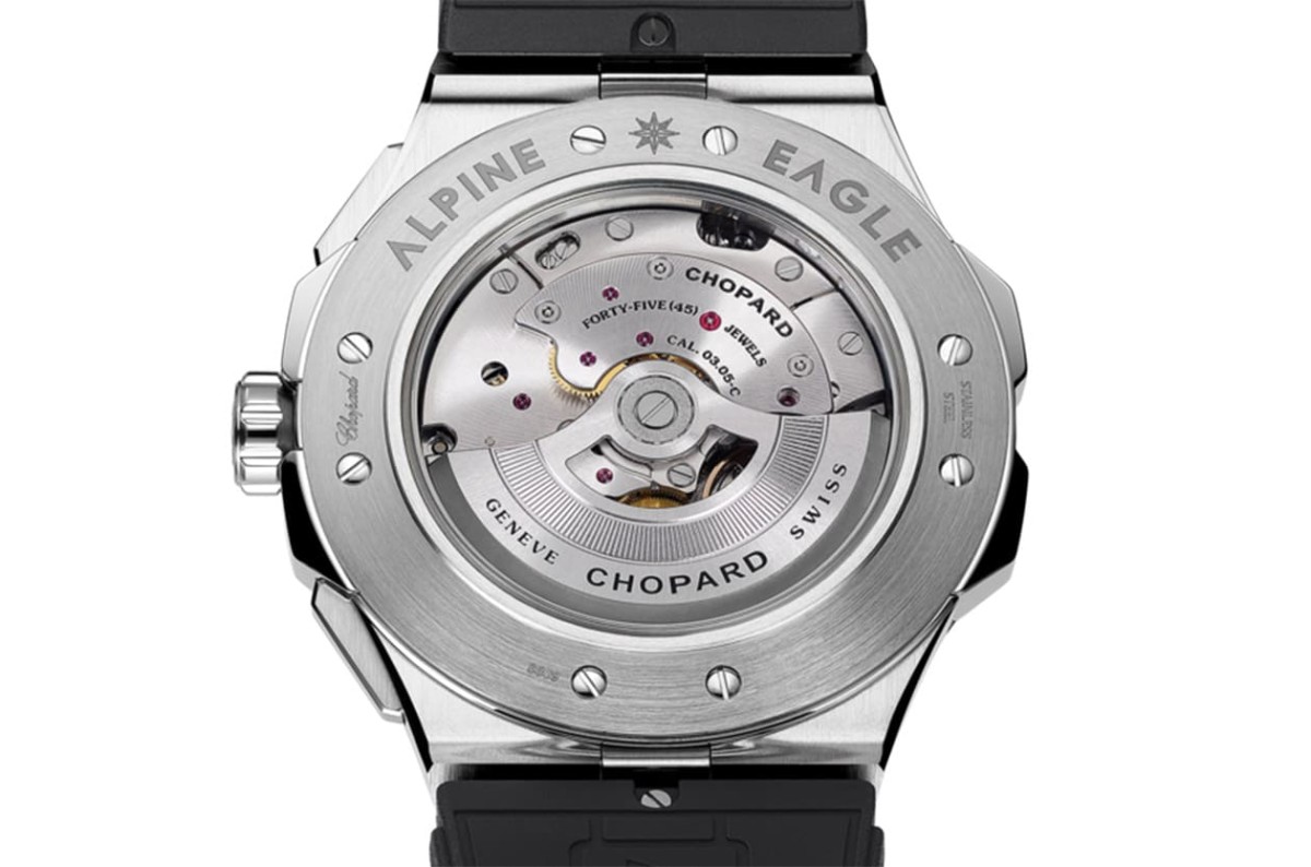 Alpine Eagle XL Chrono搭载03.05-C自动机芯,它与09.01-C同样拥有60小时的充足动能,同时萧邦在研发过程中还替机芯申请了三项专利,例如自动上链机制由单向齿轮带动,确保能兼顾上链效能以及降低能量佚失的平衡;机芯由垂直离合机制控制四番车与计时轮系的切换接轨,而它所拥有带着三个弹性臂的旋转锤还能让机芯得到飞返计时的效果,由此获得更即时精准的连续计时结果。即使功能复杂度更高,但是03.05-C依旧通过了瑞士天文台认证,带给佩戴者扎实的安定感。