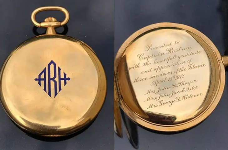 悲剧发生后一年,在铁达尼号事故中丧生的三位富商John Jacob Astor、George Dunton Widener以及John B的遗孀与家属共同决定要在纽约州Astor宅邸举办的追思餐会上,餽赠这只TIFFANY黄金怀表给Arthur Rostron船长,以向他表达无尽的感谢之意。当时除了这只怀表,Arthur Rostron还一併获得时任美国总统William Howard Taft颁发的美国国会金质奖章,不久后他也被英国乔治五世国王封为爵士,因为在铁达尼号事故中一个果断的决定,让Arthur Rostron船长被后世永远铭记,就连与他有关的物品,在事件过后超过100多年,还是被视为具有极高的历史意义与收藏价值。