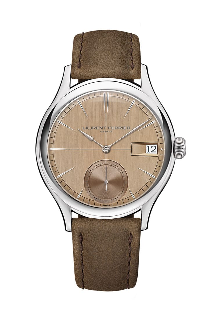 LAURENT FERRIER替手表配置的玫瑰色面盘同时拥有沙色与泥土色色泽,这种中性色调与大自然和土地紧密相连,象徵着稳定与寧静的氛围,也让人想到早期时计那种古色古香的细致格调,由于面盘有多种饰面,因此能让沙色、泥土色随着光线照射呈现由浅至深的变化。