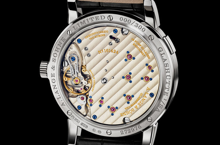 950铂金材质/L121.1手动上链机芯/偏心时、偏心分、小秒、大日期显示/动力储存显示/蓝宝石水晶镜面、透明底盖/表径38.5mm/限量300只