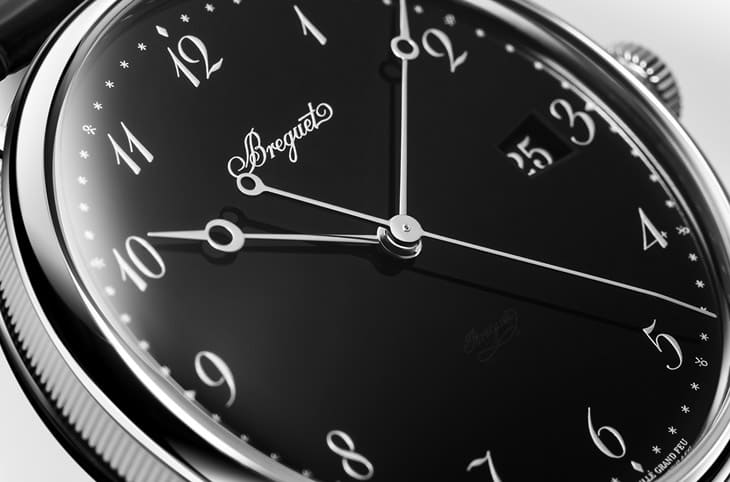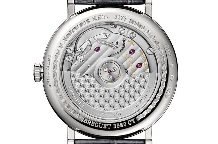 表款搭载的777Q是宝璣自制的高素质自动上链机种,其以硅质打造擒纵轮与马仔,内含双层游丝,能达到更佳的等时性效果,对提升走时精准度十分有益。机芯属于宝璣式螺丝微调摆轮,震频28,800vph,有高级品牌才会使用的活动式游丝桩,至于发条盒有一组八字形弹簧,右边为大捲车挡仔,左为自动离合轮挡仔,左右相对称,设计别出心裁。机芯的细节也具有高度可看性,18K金自动盘的机刻雕花纹路特别改为「马赛克星空」图案,与同系列机芯常用的麦穗纹有所区别,自动盘边缘另加上「Breguet édition spéciale宝璣特别版」字样,突显出这种花纹难能可贵之处,除了欣赏机芯细腻的打磨作工之外,它的动力储存55小时也是出于日常生活的实用性考量,至少一天不戴表,第二天重新戴出门时都还不用先帮手表上链,以正装表而言算是中规中矩的效能。