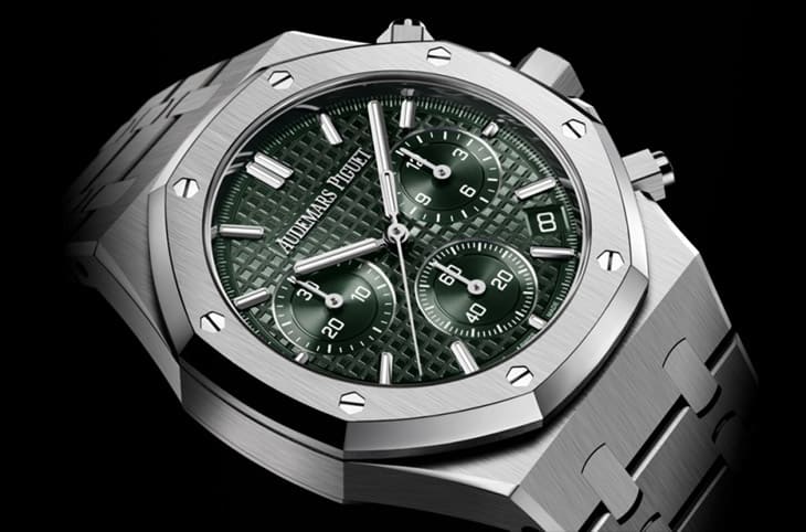 Piero Ferrari在试驾Daytona SP3时,手上佩戴的是Royal Oak Chronograph不锈钢绿面款26240ST!没错,他选的是钢壳,因此定价也是41mm的皇家橡树计时码表中相对亲切的,从Piero Ferrari选择Daytona SP3的车身涂装顏色来看,以为他偏好一些保守、朴实的顏色,结果他相中的又是钢壳皇家橡树计时码表中相对抢眼的绿面,对照他当天的蓝色西装外套与黑色西装裤,绿面手表还蛮抢镜的。这款表的面盘以系列少见的绿色示人。但它保留着招牌的Grande Tapisserie大型格纹装饰,搭配下三眼的绿色小表盘,连4~5点方向的日期窗也是绿底白字,与时标、指针涂覆的白色夜光涂层维持强烈的对比,视读效果清楚不在话下。