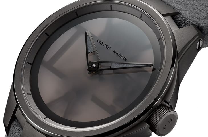 手表面盘以磨砂蓝宝石水晶打造,并且经过雷射处理,呈现冰霜般的凛冽质感;不止如此,ULYSSE NARDIN还用金属镀层创造出出烟燻效果,这正是手表的镂空面盘看起来带有神祕感的关键,雅典表透露要呈现这样的设计,过程中共费时两年以上,所以别看面盘变得清爽素雅,但是它的制作过程其实没这麼容易。力求简约的Blast [Amoureuxpeintre]霜刃手表仅维持基本的时、分显时,两枚指针一样经过碳灰色镀层上色,不过也加上了灰色Superluminova夜光涂层确保手表在暗处还是可以发挥基本显时作用。