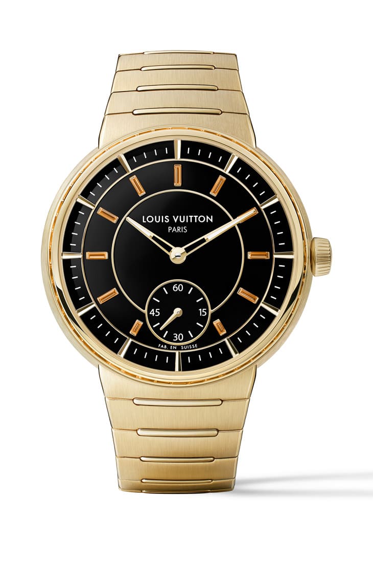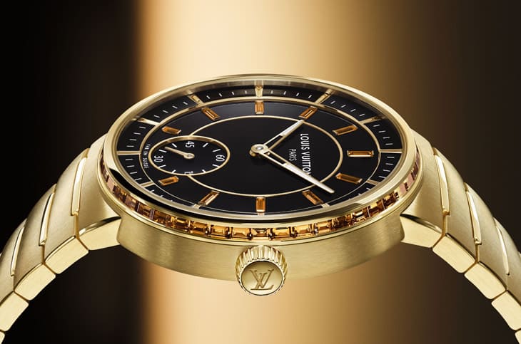 首先看到的是Tambour黄金縞玛瑙手表,其与系列既有的黄金款式主要差别在于面盘改用縞玛瑙材质,同时表圈与时标等处也加入彩色宝石点缀,手表的奢华「睛」艳感自然也更上层楼。路易威登一样用黄金制作手表的表壳与一体式链带,经过雾面与拋光修饰后,外观便富有赏心悦目的层次,也让金属光泽趋于内敛温和。
