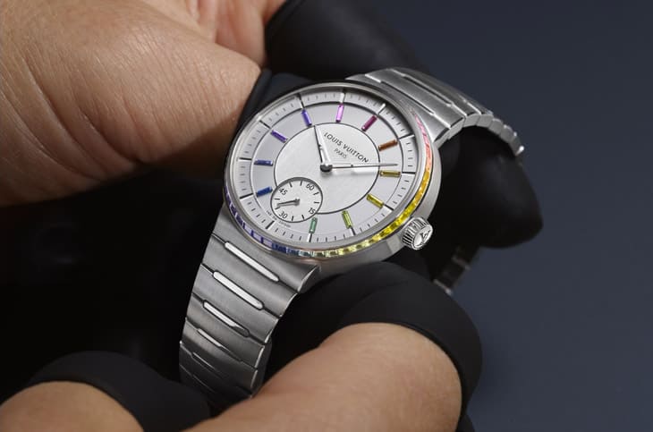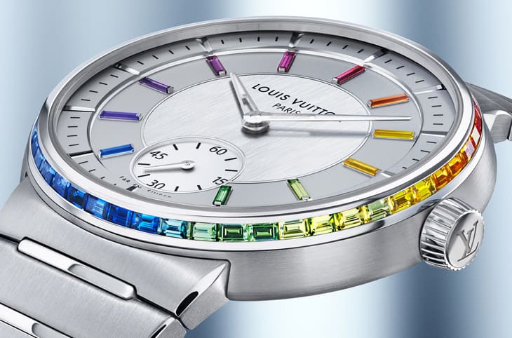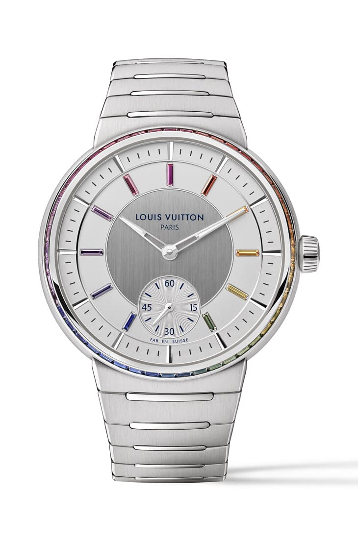 手表以银乳色面盘搭配相同顏色的蜗纹小秒盘,面盘中央额外经过拉丝处理,其银色调较深,与前述两个区域的面盘同中有异,而指针与面盘最外围的立体刻度以白金制作,如此素雅的面盘并不会让人感到单调,一方面是因为路易威登施加不同的装饰,同时也因为时标部分改镶上11颗渐变色彩蓝宝石与红宝石,形成吸睛的彩虹时标设计,而也如同Tambour黄金縞玛瑙手表,手表的表圈侧面工整镶上LOUIS VUITTON由斯里兰卡与莫三比克寻来的长方形切割刚玉,顏色遍及粉红色、紫红色、橘色、黄色、绿色、蓝色、紫色,另外也镶入了红宝石,总计光是表圈范围便镶有59颗宝石,这些宝石的净度、尺寸与切割方式几乎一致,最明显的差异则于它们的色泽,因此能达到一种渐进式的七彩效果,Tambour系列因而有有属于自己的彩虹圈作品。