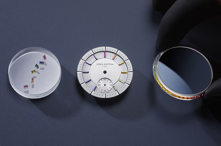 ▲路易威登由斯里兰卡与莫三比克寻访彩色刚玉及红宝石,便将其一一镶嵌在表圈与面盘上的时标部位。