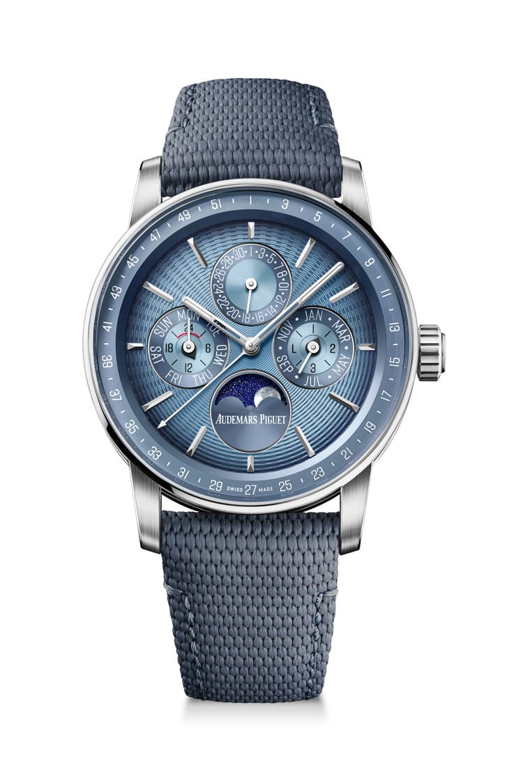 此系列首度引进Tuscany蓝色粒纹面盘,爱彼採用白金与蓝色陶瓷制作表壳,刚好和面盘的蓝色互相辉映。面盘周围点缀长方形切割钻石时标,与蓝色蜗纹小表盘形成鲜明对比。白金指针表圈、表耳和底盖周围的材质一致,并且还覆有夜光涂层强化读时效果。手表搭配蓝色纹理橡胶表带,其内衬为小牛皮展现高级感,表带的针扣亦以白金制成,于材质应用上完整贯串外部的大小零件。手表内部的4409自动机芯为这款双色手表提供充足动力,透过透明底盖可欣赏机芯结构以及精致的22K金镂空自动盘。