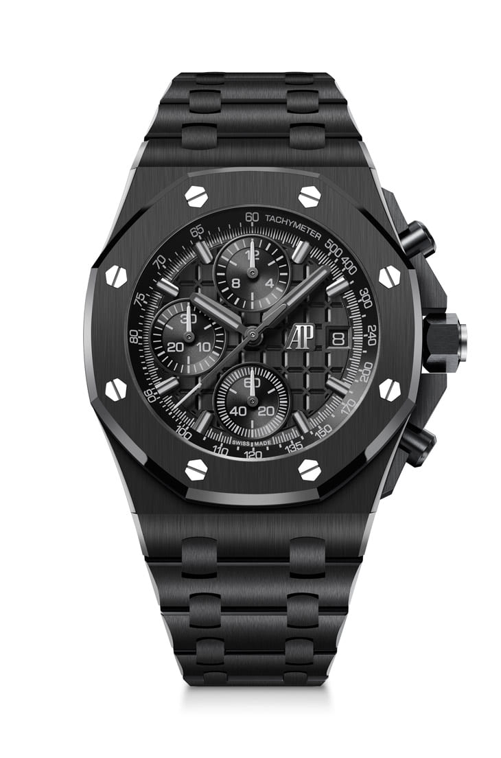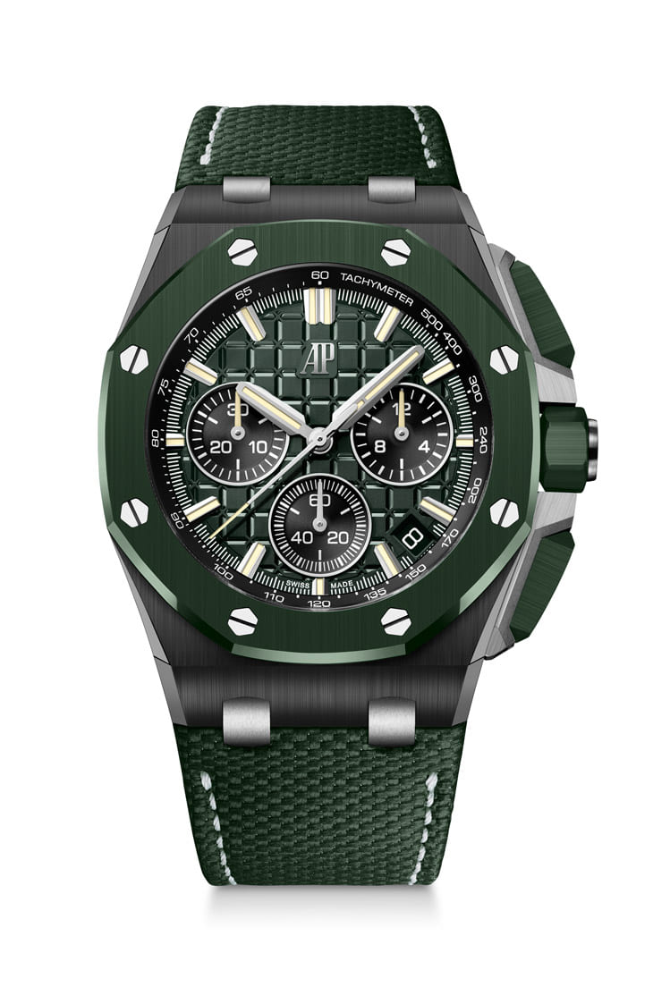两款全新Royal Oak Offshore皇家橡树离岸型⾃动计时码表,一方面传承系列特色,同时也继续挖掘陶瓷材质的创作可能。第⼀表採⽤三⾊设计,彰显运动风格,其43mm⿊⾊陶瓷表壳搭配绿⾊陶瓷表圈、表冠和按把,与钛⾦属细节形成对比。第⼆款採⽤⿊⾊单⾊设计,42mm表壳及⼀体式链带皆以⿊⾊陶瓷制作,两款表均搭载AUDEMARS PIGUET新世代的⾃动计时机芯:4401和4404机芯。佩戴者可透过蓝宝⽯底盖,欣赏精致的机芯装饰。