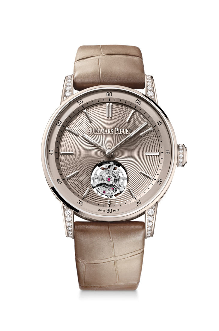 全新CODE 11.59自动飞行陀飞轮是38mm款式,以18K沙金及明亮式切割美钻打造,此款是爱彼38mm表款中首款自动上链飞行陀飞轮作品。其内含超薄RD#3机芯(2968机芯),糅合精致美学与尖端性能。表款传承AP制表理念,集传统工艺、尖端科技、精致设计于一身,为新一代小尺寸CODE 11.59系列复杂作品揭开序幕。