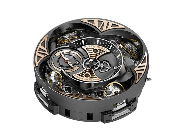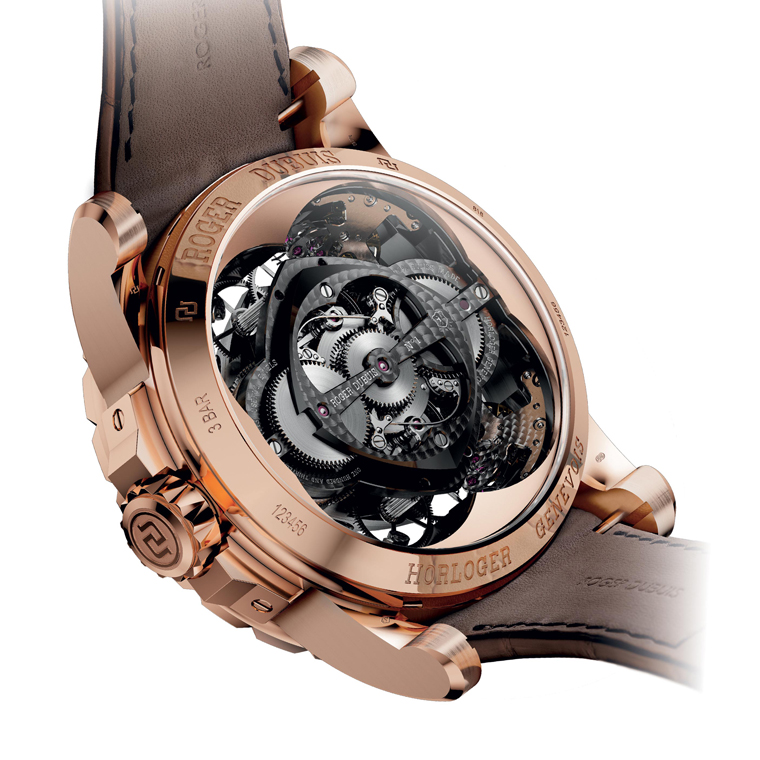 2005年,ROGER DUBUIS罗杰杜彼推出一款配备差速器(differential)的飞行陀飞轮手表,技惊表坛。凭藉表厂凝聚的卓越技术,经过七年研发时间,品牌再推出Excalibur Quatuor手表。一如命名,这只手表首创配备四组擒緃系统,另一大卖点则是五组差速器,在机芯佈局方面,上方的两组擒緃系统为一对,下方的两组则是另一对,每对擒緃系统皆以一组差速器连结,并于中轴设置一组差速器,用于串连两对擒緃系统,如此一来,无论佩戴者的手腕处于任何方位,皆能瞬间平均四枚摆轮的输出动力,令走时愈加精准,运作效果更胜陀飞轮。