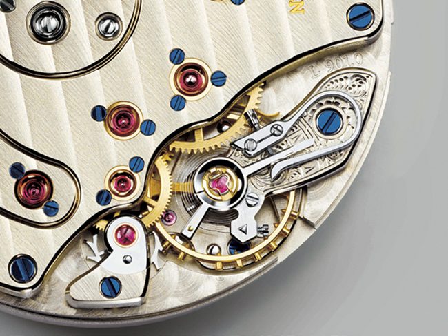 朗格手表由其周身细节中即能窥见品牌一脉相传、跨越百年歷史的扎实表艺精神,凝聚成辨识度极高的品牌经典元素:首先最令人熟悉的特色莫过于採用3/4比例的机芯基板格局,其为1864年时阿道夫.朗格为了强化时计走时准度与整体耐用度所创制,大片的基板覆盖能促使机芯零件更为紧密联繫,从基板上一丝不苟的打磨及实用目的导向正好能突显德式工艺思维。而在机芯的基板和夹板的选材上,朗格向以运用未经处理「德国银」材质着称,其为一种混合铜、锌、镍3种金属,并依5:2:2比例所调制而成的合金,非指德国本土出产的银材质,不过随着时间堆叠,该合金会呈现出一种近似银质的光泽而得名。朗格时计的另一传统特色即是于擒纵系统可见的机芯调速机制——鹅颈式微调,其在快慢针的基础上再添上一状似天鹅颈部曲线的弹簧,透过鹅颈式微调掌控游丝长度以达到准时调校的功用,属于高阶版的机芯微调系统。同样围绕擒纵系统可见的朗格传统制表元素尚有位于微调系统下方用以支撑擒纵装置的摆轮夹板,其表面能欣赏到由品牌工艺师刻凿的雕花纹路,多彩多姿的刻纹图腾霎时赋予擒纵结构衍生的视觉美感。