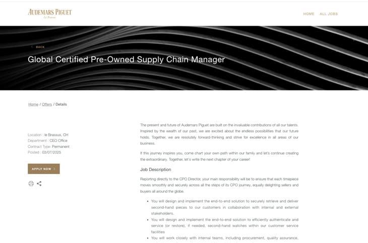 而其实爱彼要推CPO的计画早在2023年就已经传出,不过这段时间以来似乎还在只闻楼梯响的阶段,近期SJX Watches的报导则有比较明确的消息,例如他们指出AP CPO计画会交由江诗丹顿前数位行销主管Marc Montagne来负责建构,而位于布拉苏丝的爱彼总部也会组成一支专业团队处理相关事宜;有意思的是,爱彼最近还在官网上释出徵才讯息,其中就包含原厂认证中古表服务的供应链经理,看起来的确是正在为了之后计画上线而准备无误。