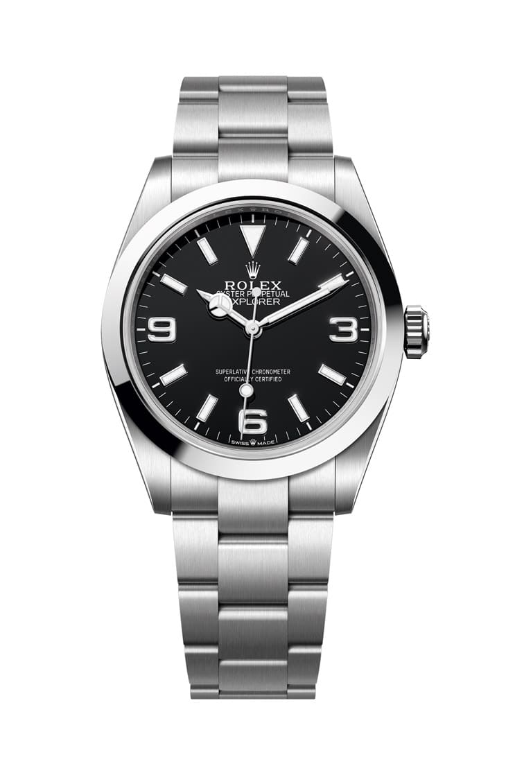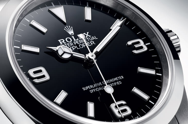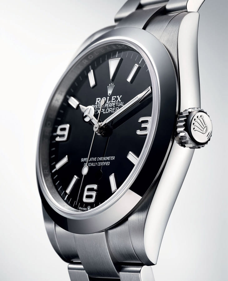 Explorer的面盘设计打从1953年的元祖款式以来就是黑面搭配白色时标,这个特徵一路延续至今。表款有个重点特色即在于,它的12点方向时标是倒三角形,3、6、9点方向是阿拉伯数字时标,至于其他部分则又是棒状时标,因此这3、6、9点的设计就塑造出Explorer成员的辨识度,而黑色面盘上搭配的则是劳力士手表常用的宾士针,或许设计本身并没有特别花俏,但只要提到探一,你脑海中就是能马上浮现它面盘的经典样式。有趣的是,Explorer的时标发展到现在有愈变愈粗的倾向,阿拉伯数字方面的字体样式也跟原版有了时代变迁的轨跡,不过劳力士的设计前提一样是为了能够一目了然的读时,这种探险家精神还是数十年如一日。
