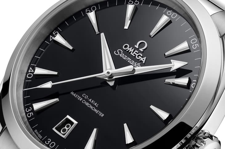 ▲换上黑色亮漆面盘让海马Aqua Terra 150米看起来更清爽利落,同时也透过强化细节如日期窗边框增益手表质感。