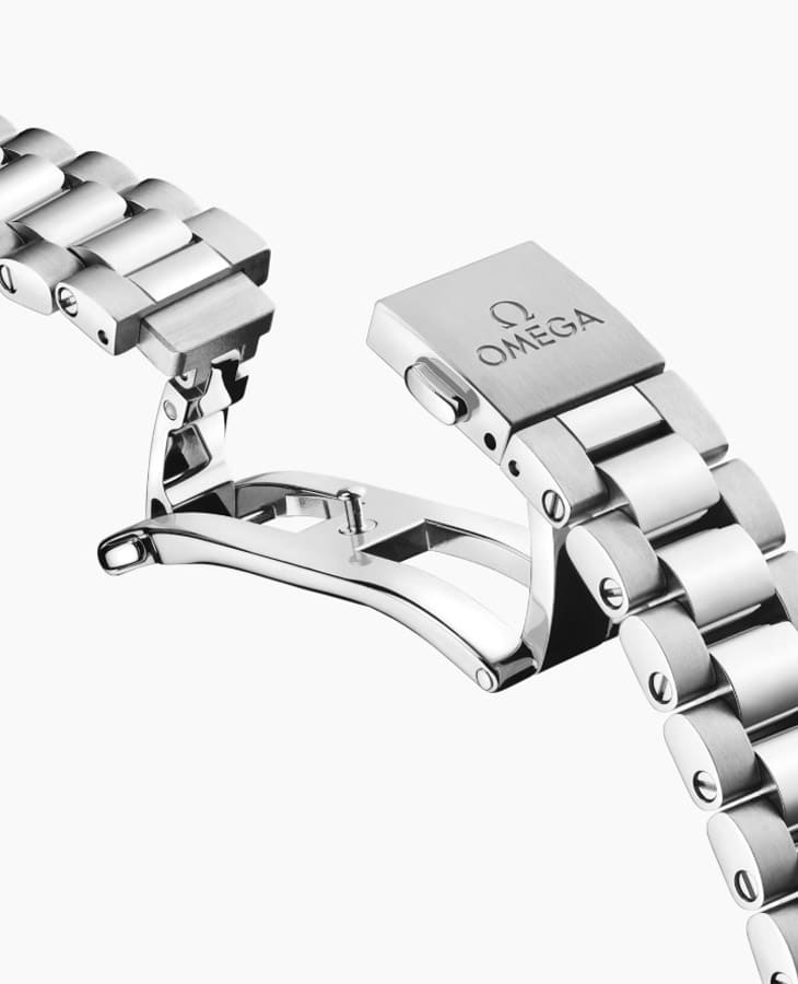 随着面盘换上黑色亮漆,留意到手表的链带也一併改用了更新后的设计,其为抛光中央链节与两侧磨砂链节组合成整合式的链带造型。包括表壳和链带的打磨工艺在相同价位带的产品中都有相对优异的水准,只是有些人可能会觉得把中央链节拿去拋光虽然在手表新新的时候显得很亮、很闪,但一方面多了日后可能留下使用后刮痕的隐忧,而且以运动表定位而言,若能将链带完全以磨砂处理可能也会更对味,还好Aqua Terra本来就不是特别强调专业运动机能的作品,因此运用不同的装饰拋磨工艺主要还是为了展现视觉的层次、强化手表的高级感。手表的链带有个好处在于表扣内含微调装置,可以稍加调整适合自己腕围的链带长度,让手表戴得更贴手也更舒适。