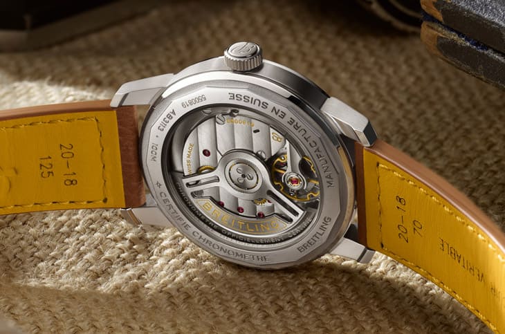 在透明底盖下可以一窥B31机芯的面目,它底板与夹板上的日内瓦波纹、鱼鳞纹,自动盘上的不规则纹理都很细致工整,零件边缘的倒角拋光也都一丝不苟,具体而微地展现出高级机芯的架势,原来百年灵历时四年开发出这款基础机芯,其拥有镂空双向自动盘、微调螺丝摆轮等设计,机芯在出厂前的测试相当严格,例如100,000次表冠上链、3,456,000次自动盘转动,以及60,000次500G冲击击等等,确保机芯品质够强悍,另外在走时精准度方面,它也延续百年灵传统通过COSC瑞士天文台认证,证明其精准度值得信赖。B31机芯以及Top Time B31大三针本身还有两大很吸引人的优点,一是动力储存长达78小时,二则是百年灵提供手表5年保固,从中显示BREITLING对自家作品的满满信心。