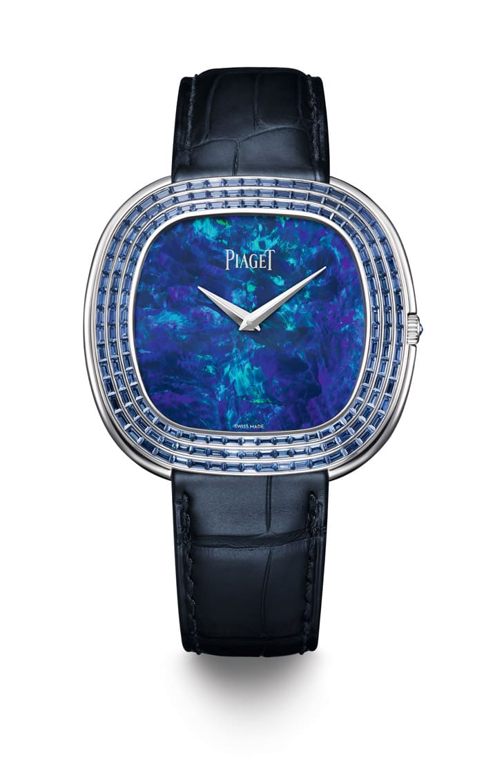 此次亮相的Andy Warhol系列新作,充分展现了PIAGET的色彩美学以及驾轻就熟的装饰工艺。其中一款顶级珠宝时计作品,是此系列的第二款珠宝时计,选用了黑色蛋白石与蓝宝石精心打造,以夺目的高级时装色彩重新诠释了1972年原版设计的所有美学特徵;相较于2023年Metaphoria顶级珠宝系列中那款木化石面盘搭配祖母绿时标的作品,此次的新作呈现有别于前者暖褐与鬱绿色调、且是伯爵向来喜爱运用的蓝绿色。在这款作品中,蛋白石的光辉因其油彩和周围蓝宝石的映衬而更加夺目,伯爵的宝石学家们匯集这一组成色均匀、光芒闪耀的蓝宝石实属不易,成果自然也令人惊艳。