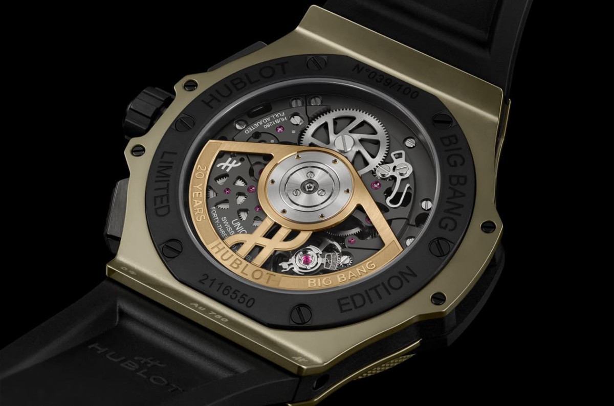 ▲从表冠顶部到22K金质镂空自动盘上都可见20周年纪念字样,具体而微强调Big Bang系列一路走来的丰硕历程。