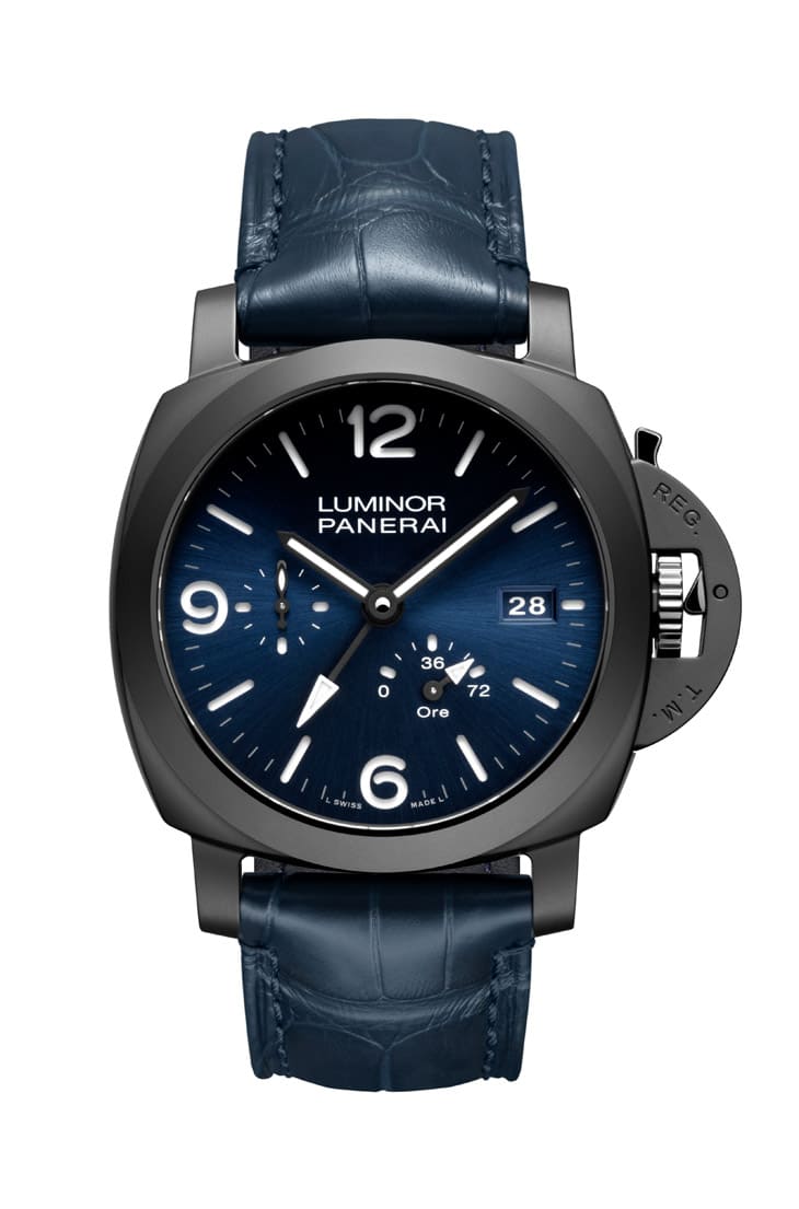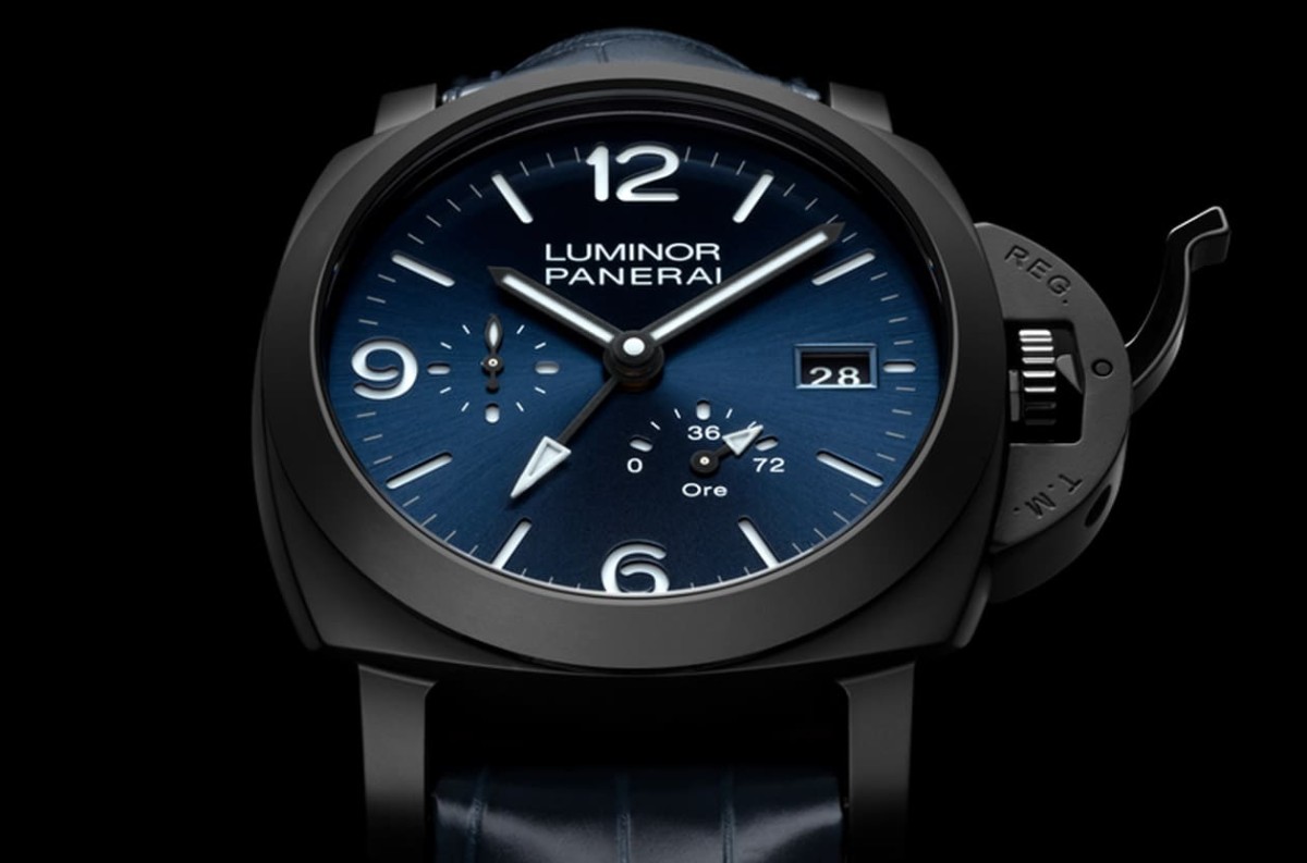 手表设计细节同样令人爱不释手,PAM01574採用经典的三明治面盘设计,搭配蓝色太阳放射纹面盘,在5点方向设有动力储存显示,还贴心印上义大利语"ORE"(小时之意),既向沛纳海的义式风格致敬,又以清晰实用的设计显示剩餘动力,是日常使用的重要功能。此外包括12小时制的两地时间指针、3点方向的斜面日期视窗以及面盘边缘的刻度等,设计用意都出于令佩戴者能够更高效且精准地读取时间。这款作品就连容易为人忽略的夜光涂层方面也很讲究,例如时标、时针和分针均涂覆了白色的Super-LumiNova® X2夜光涂层,而动力储存显示和两地时间指针则涂覆了蓝色的Super LumiNova® X1夜光涂层,确保在黑暗环境中也能清晰可见,也容易区辨不同的资讯。