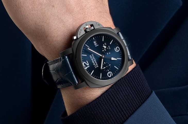 有关手表的搭配性,PAM01574附有两条表带——一条是优雅的蓝色鱷鱼皮表带、一条则是运动风格的蓝色橡胶表带,好消息是两者皆搭配沛纳海专利的快拆系统,无需工具就能轻松切换,表主可以自由选择当天想要的风格和个性。