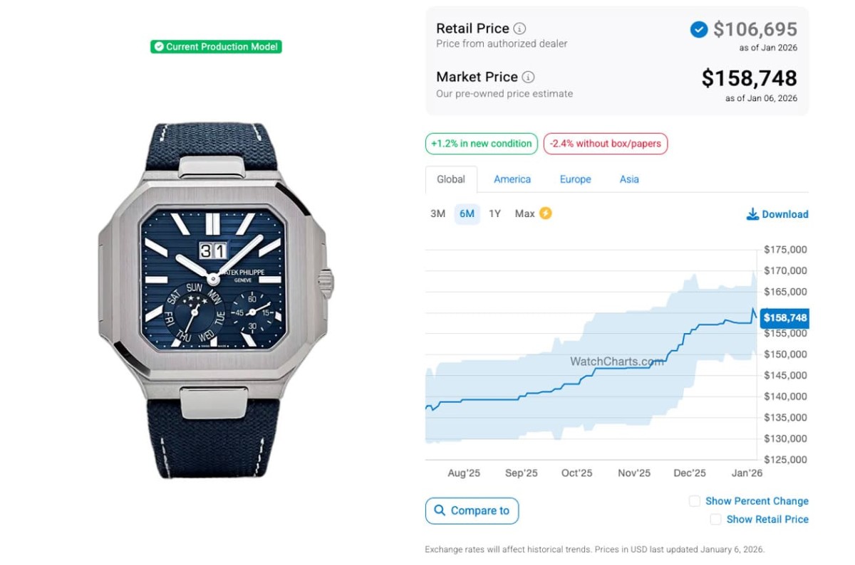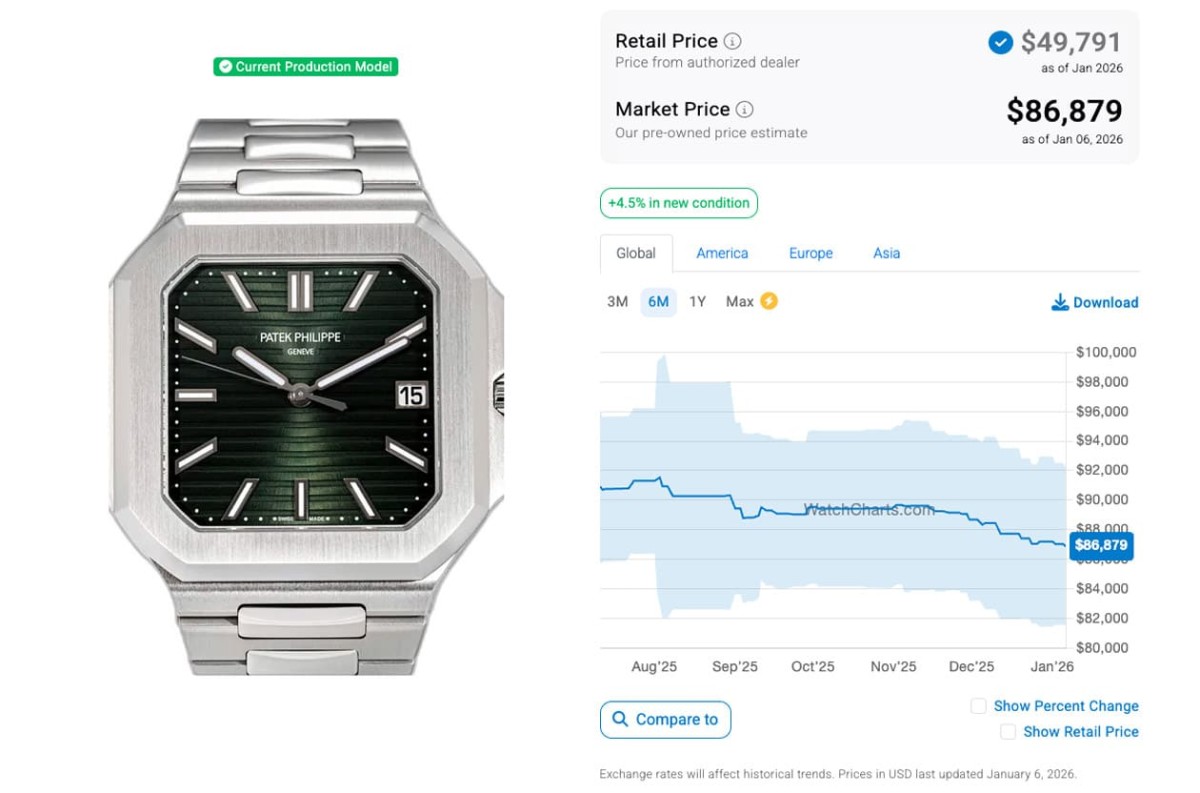 来到六个月后的现在、转眼间到了2026年,两款Cubitus系列人气作这期间的价格走势各有发展,从WatchCharts的观察可知,两款表都是刚进入二级市场时行情很高,然后从2024年底到2025年后身价一路下修,其中5821/1A-001进入2025年4月后价格大致就守在8万8千美金那条线以上,7、8月时曾小涨一波但很快就又跌下来,接着一路持平到12月后又开始溜滑梯,跨年前跌破8万8千美金,到2026年1月后还在下滑,最新的报价来到86,879美金(约合台币274万6);反观5822P-001也是2025年第一季行情直直落,但从5月迄今后跨了年身价都逐月上升,现在已经是一年来的身价高峰期,最新报价为158,748美金(约合台币501万7)。