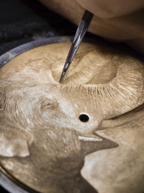 微雕大象图案经过氧化工序后,绽放层次丰富的色泽。接着,工匠以木栓和打磨膏打磨作品,以增加光泽。最后,以墨彩涂于作品表面。在整个复杂的微雕过程中,工匠不时以钻石及陶瓷圆盘打磨雕刻工具,以达致媲美解剖刀的尖锐刀锋和精确度。大象俐落的线条令人惊叹。这是歷史上首只以金属微雕技术颂扬大象高雅雄姿的手表,为伯爵的大师级工艺技术平添另一欣赏角度。