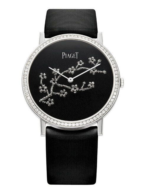 '13年所推出的Piaget Altiplano珍贵线刺绣手表,融合了中国数千来以来的刺绣精华,以金线刺绣工艺,为面盘设计开拓崭新领域,成就动人心魄的旷世之作,这种刺绣手法在表坛十分少见,不过刚在本年度GPHG获奖的香奈儿表款中,便应用了此一独特技艺。在制作程序上,首先丝绸被拉紧并固定于框架之上,再由工匠描出图案线条。接着,刺绣工匠以锈针将金线绞成螺旋状的金丝细工,再以无穷耐心将构图细节逐一绣于丝绸上。