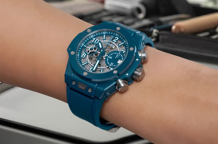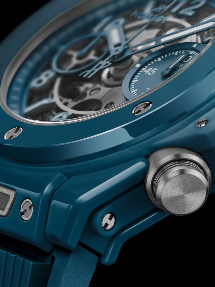 ▲Big Bang Unico石油蓝陶瓷计时码表功能镂空面盘呈现导柱轮与齿轮运作之美,结合性能与机械艺术。