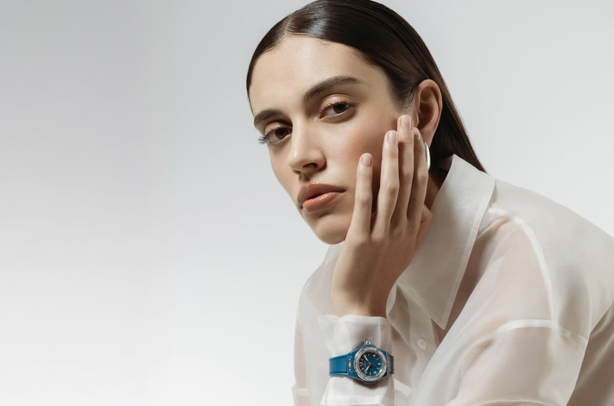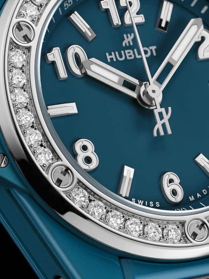 ▲Big Bang One Click石油蓝陶瓷钻表表圈镶嵌36颗钻石闪耀如星光,青灰蓝面盘比例纯粹,映衬女性自信与柔韧气质。
