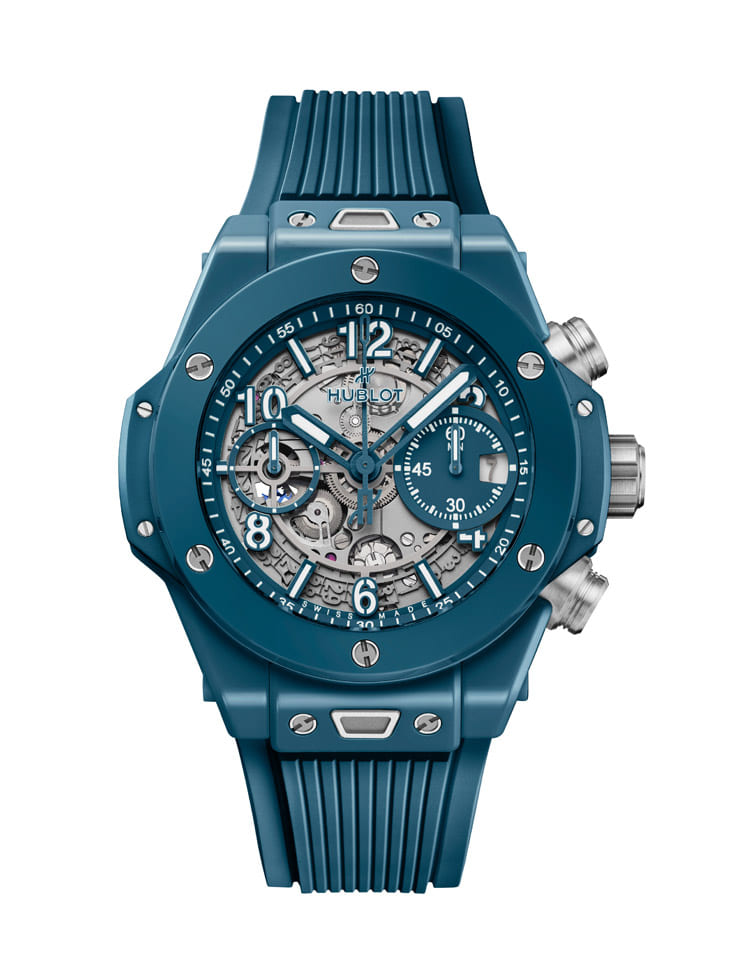 石油蓝陶瓷材质/HUB1280自动上链机芯/时、分、小秒、日期显示/计时码表功能/蓝宝石水晶镜面、透明底盖/防水100米/表径42mm/参考价:NT$ 781,000