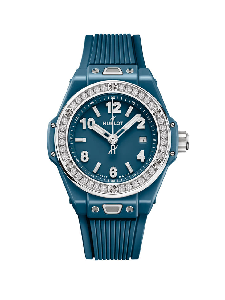 石油蓝陶瓷材质/HUB1120自动上链机芯/时、分、秒、日期显示/表圈镶钻36颗,约重0.76克拉/蓝宝石水晶镜面、透明底盖/防水100米/表径33mm/参考价:NT$ 567,000