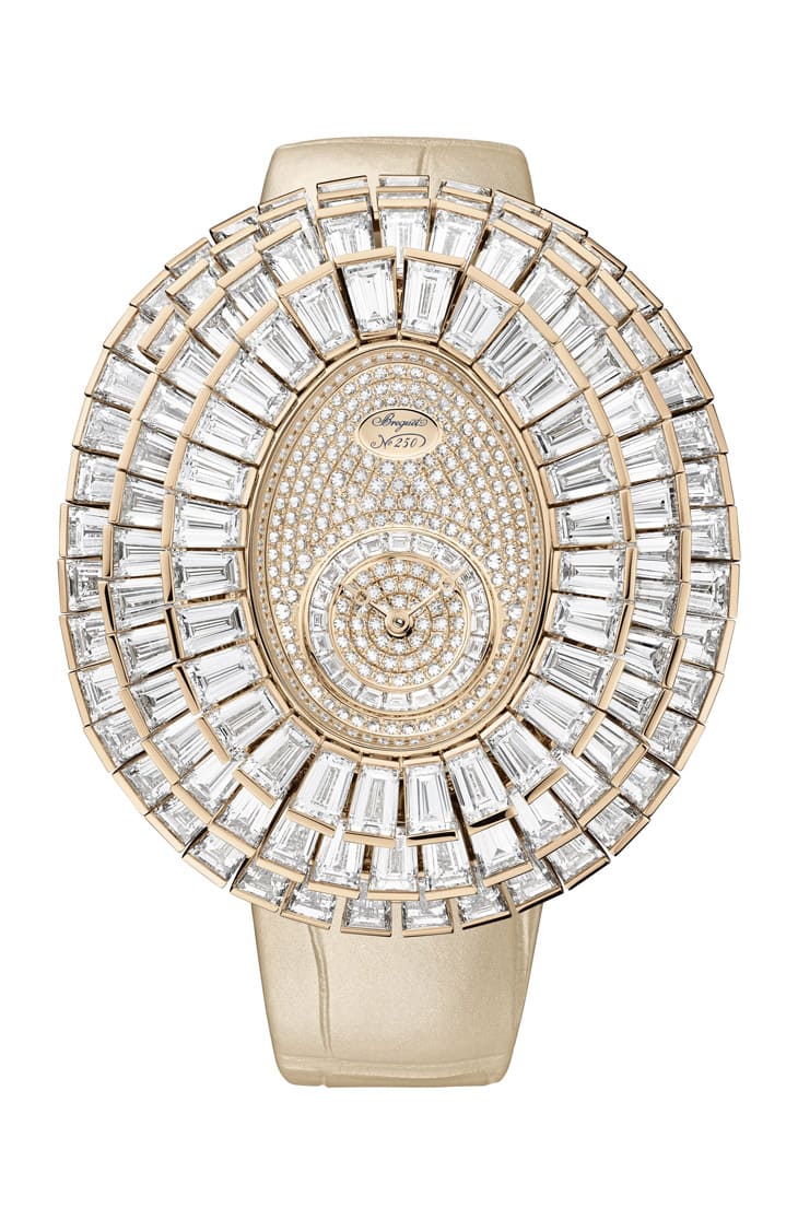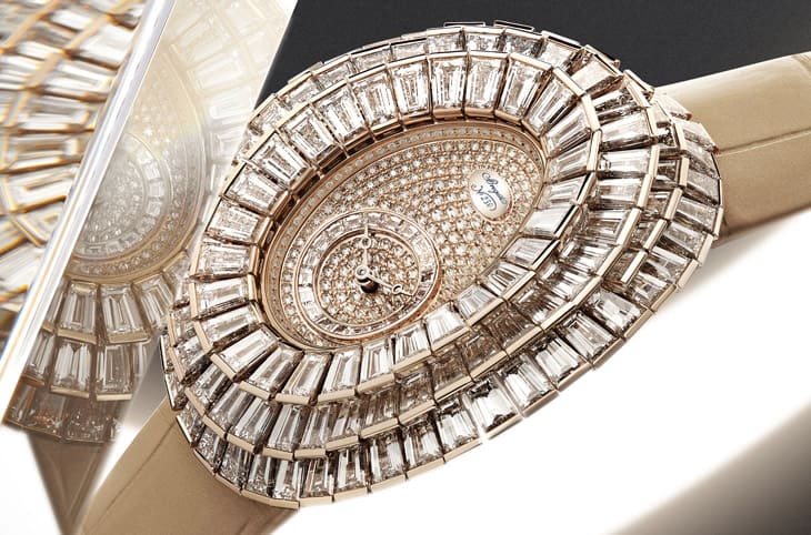 18K宝璣金材质/586/1自动上链机芯/偏心时、偏心分显示/表壳镶钻116颗,约重34.6克拉、面盘外缘镶钻66颗,约重0.1克拉、面盘镶倒置式钻石206颗,约重0.8克拉、长方形切割钻石20颗,约重0.4克拉/蓝宝石水晶镜面、透明底盖/表径32.10x24.5mm