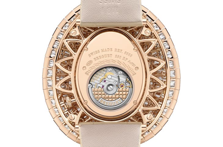 值得注意的是,这两款手表皆搭载5861/586/1自动上链机芯,由180枚零件组成,厚度仅3.9mm,内含29颗宝石轴承,以3Hz震频运作,提供约38小时动力,机芯内含硅质扁平摆轮游丝及倒置硅质槓杆式擒纵机构,提升精准度与稳定性,在部分蓝宝石水晶底盖下,可见由铂金制作的自动盘,并刻有手工机刻Petit Trianon小特里亚农宫图案。而且为纪念品牌250周年,金属底盖部分还鐫刻上"BREGUET 250 YEARS"字样,突显历史传承与收藏价值。