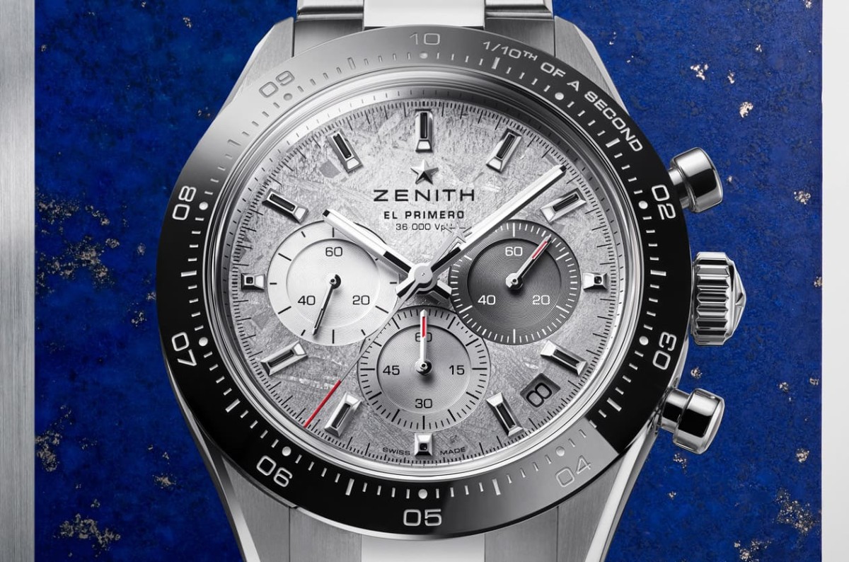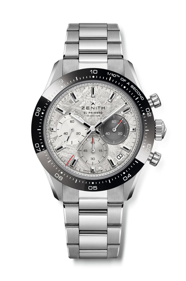 面盘採用源自宇宙的陨石材质,是这款腕表最具个性的亮点,陨石切割后所呈现的魏德曼花纹(Widmanstätten Pattern)具备几何且不可复制的自然结构,使得每一只表都是独一无二。ZENITH为呼应此材质的金属冷色调,将原本的三色计时盘改为银、浅灰、碳灰的同色阶配置,整体质感低调、洗链,展现出与一般Chronomaster Sport同中求异的风格。